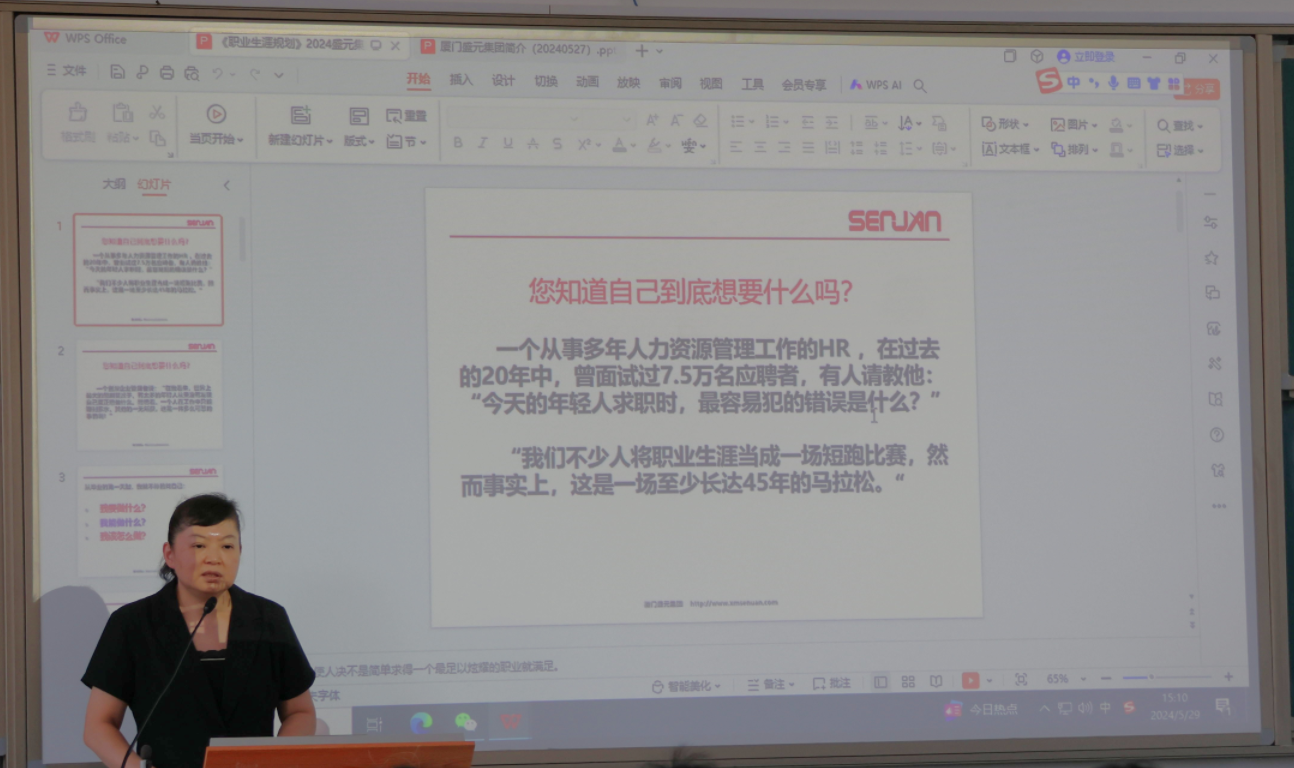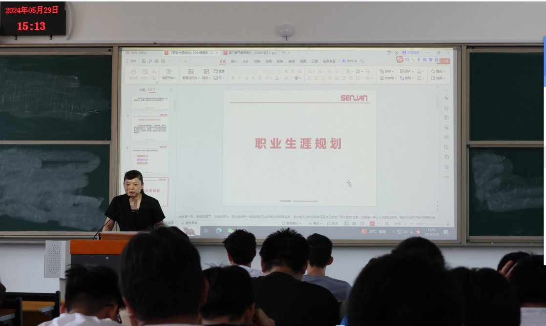 為了讓學生提前了解企業(yè)需求和行業(yè)動態(tài),有針對性地提升自己的技能和素質(zhì),提高就業(yè)的適配性和成功率,同時也為企業(yè)儲備人才,加強校企合作,給即將走出校園的學子提供更多了解職場、做好職業(yè)生涯規(guī)劃。2024年5月29日下午,汽車學院邀請廈門盛元集團資深人事總監(jiān)黃蓉女士為2022級部分學生做了一場精彩的職業(yè)生涯規(guī)劃講座。
