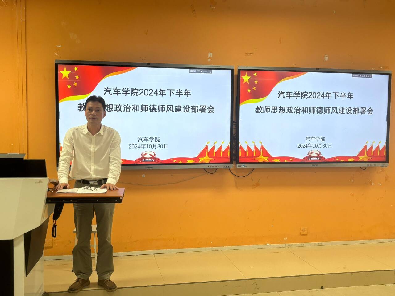 為深入學(xué)習(xí)貫徹黨的二十屆三中全會精神和習(xí)近平總書記關(guān)于教育的重要論述,不斷提高教師思想政治和師德師風(fēng)建設(shè)工作水平,根據(jù)學(xué)校部署要求,汽車學(xué)院于2024年10月30日召開2024年下半年教師思想政治和師德師風(fēng)建設(shè)部署會議,會議由學(xué)院黨總支書記蔡華錦主持,全體教職工參加會議。