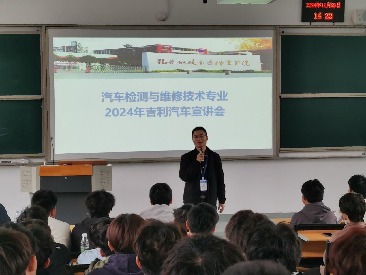 為進(jìn)一步推進(jìn)校企合作,提高人才培養(yǎng)質(zhì)量,拓展畢業(yè)生就業(yè)渠道。2024年11月20日,汽車(chē)學(xué)院在8號(hào)樓三階教室舉行了吉利訂單班專場(chǎng)宣講會(huì)。吉利汽車(chē)校企合作企業(yè)代表、汽車(chē)學(xué)院院長(zhǎng)蘇慶列、汽車(chē)檢測(cè)與維修技術(shù)專業(yè)主任曾雪蓮、吉利校企合作項(xiàng)目負(fù)責(zé)人呂翱、專任教師張光葳、輔導(dǎo)員黃見(jiàn)山出席本次會(huì)議,汽車(chē)學(xué)院2024級(jí)汽車(chē)檢測(cè)與維修技術(shù)專業(yè)學(xué)生等共計(jì)100余人參加此次會(huì)議。
