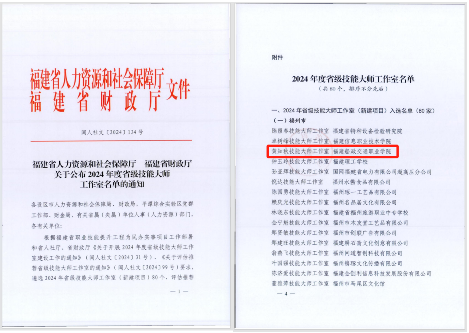 近日,福建省人力資源和社會保障廳、福建省財政廳發(fā)布《關(guān)于公布2024年度省級技能大師工作室名單的通知》,經(jīng)學(xué)院組織申報、省教育廳推薦、省人社廳評審遴選,我院汽車學(xué)院實訓(xùn)中心主任黃知秋領(lǐng)辦的“黃知秋技能大師工作室”入選2024年省級技能大師工作室建設(shè)項目。