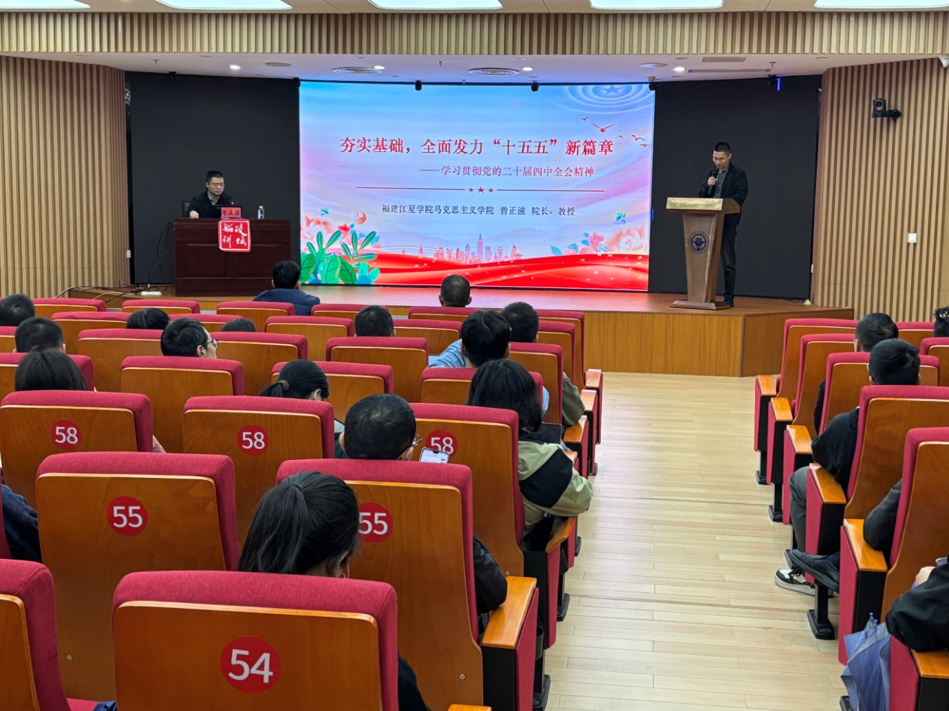 為深入學(xué)習(xí)貫徹習(xí)近平總書記在黨的二十屆四中全會上的重要講話精神和《中共中央關(guān)于制定國民經(jīng)濟和社會發(fā)展第十五個五年規(guī)劃的建議》,深刻認識全會的重大意義, 11月12日下午,特邀福建江夏學(xué)院馬克思主義學(xué)院院長曾正滋教授以夯實基礎(chǔ),全面發(fā)力“十五五”新篇章為主題的學(xué)習(xí)貫徹黨的二十屆四中全會精神專題講座。
