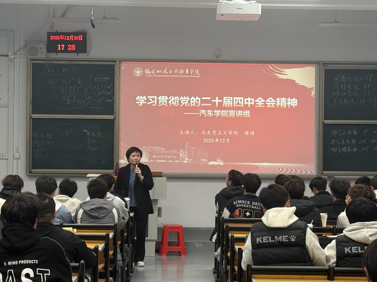 此次專題宣講是汽車學(xué)院深化“大思政課”育人格局的重要舉措,不僅推動了黨的二十屆四中全會精神在我院的貫徹落實,更搭建起理論武裝與思想引領(lǐng)的堅實平臺。我院將以此次宣講為契機,持續(xù)推動全會精神學(xué)習(xí)走深走實,引導(dǎo)青年學(xué)子以全會精神為根本遵循,胸懷“國之大者”,勇?lián)鷷r代使命,主動將個人理想追求融入國家發(fā)展大局與民族復(fù)興偉業(yè),切實把學(xué)習(xí)成效轉(zhuǎn)化為立足專業(yè)深耕細(xì)研、投身實踐服務(wù)社會的實際行動,在推進(jìn)中國式現(xiàn)代化建設(shè)的新征程中書寫無愧于時代、無愧于青春的奮斗答卷。