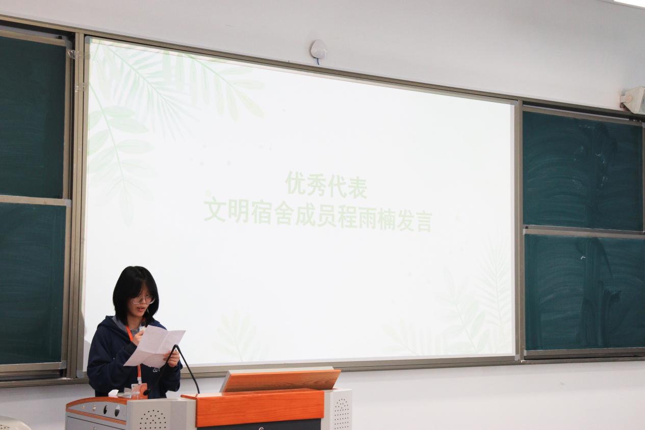 在交流分享環(huán)節(jié),獲獎宿舍代表程雨楠結合日常管理經(jīng)驗,從衛(wèi)生維護、安全值守、學風共建、團隊協(xié)作等方面展開分享。在她看來,文明宿舍的建設離不開“分工明確、互相包容”的相處之道,更得益于“勤學互助、共同進步”的良好氛圍,小小的宿舍不僅是生活居所,更是錘煉品德、共同成長的“第二課堂”。