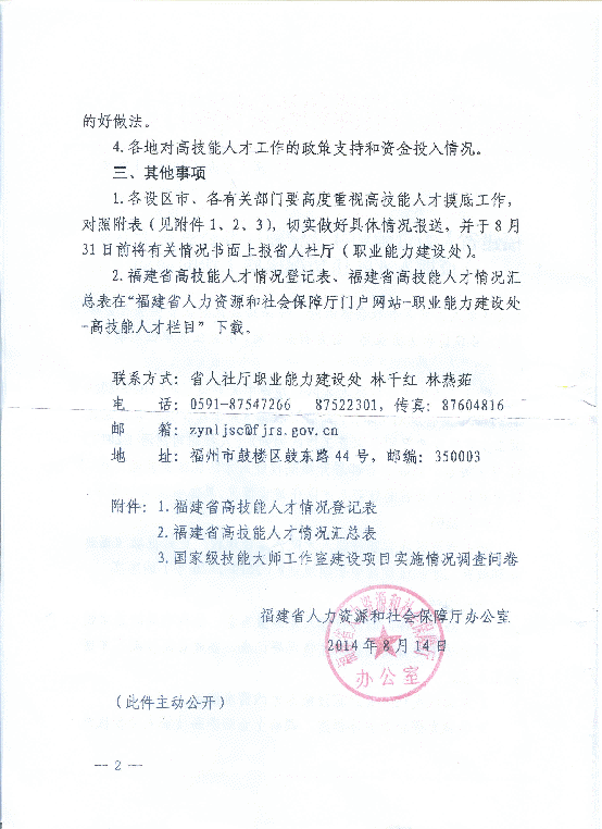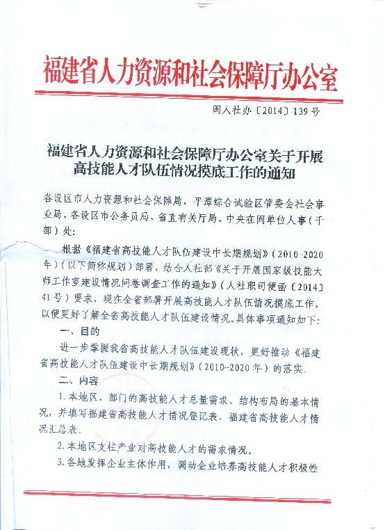 福建省人力資源社會(huì)保障廳辦公室關(guān)于開展高技能人才隊(duì)伍情況摸底工作的通知