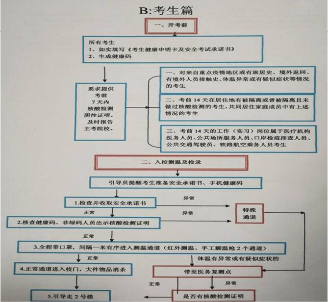 2.來自重點疫情地區(qū)或有旅居史、境外返回、境外人員接觸史、體溫異常或有疑似癥狀等情況,考前14天曾被隔離或曾被隔離未做過核酸檢測、共同居住家庭成員有上述情況的考生,考前14天的工作(實習)崗位屬于醫(yī)療機構醫(yī)務人員、公共場所服務人員、口岸檢疫排查人員、公共交通駕駛員或鐵路航空乘務人員的考生,上述考生須提供考前7天內(nèi)核酸檢測陰性證明后方可進入學校,無提供核酸證明者不得進入校園!