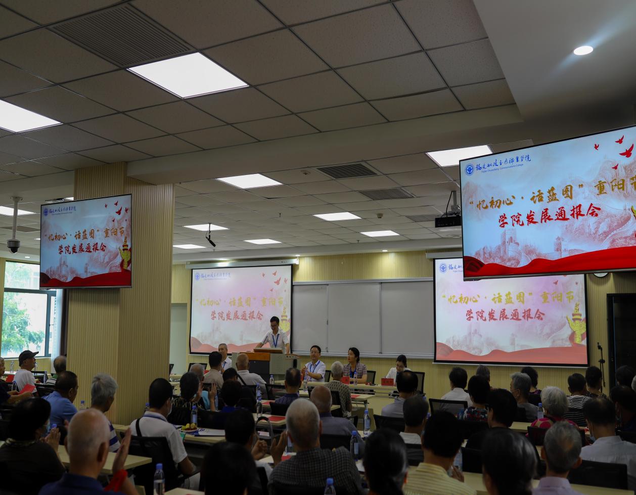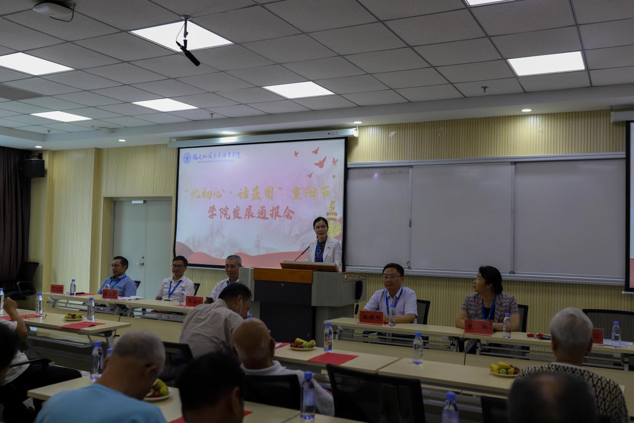 隨后,“憶初心、話藍(lán)圖”重陽(yáng)節(jié)學(xué)院發(fā)展通報(bào)會(huì)在培訓(xùn)學(xué)院會(huì)議室隆重召開(kāi),學(xué)院領(lǐng)導(dǎo)班子成員、職能部門負(fù)責(zé)人、離退休教師參加了大會(huì)。會(huì)議由學(xué)院黨委副書(shū)記陳宜大主持。