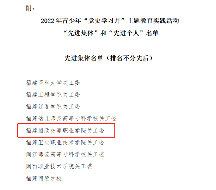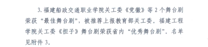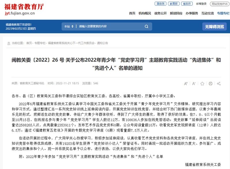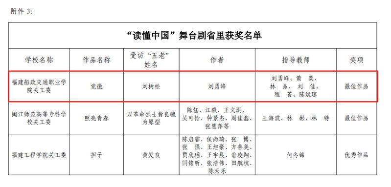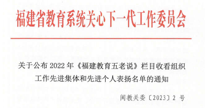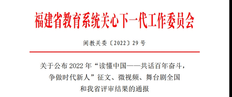 日前,福建省教育系統(tǒng)關(guān)工委公布了2022年《福建教育五老說》欄目收看組織工作先進(jìn)集體和先進(jìn)個(gè)人表揚(yáng)名單、2022年青少年“黨史學(xué)習(xí)月”主題教育實(shí)踐活動(dòng)“先進(jìn)集體”和“先進(jìn)個(gè)人”名單以及 2022 年“讀懂中國——共話百年奮斗, 爭做時(shí)代新人”舞臺(tái)劇評(píng)審結(jié)果,我校關(guān)工委榮獲先進(jìn)集體2個(gè),先進(jìn)個(gè)人1名,舞臺(tái)劇《黨徽》榮獲最佳作品獎(jiǎng)。