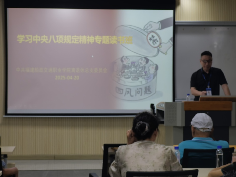 為進(jìn)一步加強(qiáng)離退休干部黨員的思想政治建設(shè),4月20日,福建船政交通職業(yè)學(xué)院離退休黨組織舉辦了專題讀書班,將學(xué)習(xí)中央八項(xiàng)規(guī)定及其實(shí)施細(xì)則精神作為重要內(nèi)容,組織廣大離退休干部黨員全面系統(tǒng)學(xué)習(xí)了習(xí)近平總書記關(guān)于加強(qiáng)黨的作風(fēng)建設(shè)的重要論述。