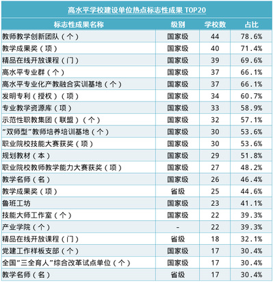 從統(tǒng)計(jì)數(shù)據(jù)來看,國(guó)家級(jí)教師教學(xué)創(chuàng)新團(tuán)隊(duì)成為“雙高計(jì)劃”56所高水平學(xué)校建設(shè)單位標(biāo)志性成果最熱詞匯,44所院校(78.6%)均將建設(shè)國(guó)家級(jí)教師教學(xué)創(chuàng)新團(tuán)隊(duì)列為標(biāo)志性成果;其次是國(guó)家教學(xué)成果獎(jiǎng)、國(guó)家精品在線開放課程、國(guó)家高水平專業(yè)群、國(guó)家高水平專業(yè)化產(chǎn)教融合實(shí)訓(xùn)基地,分列第2至第5位,超過60%的院校標(biāo)志性成果中涵蓋了這些指標(biāo)。