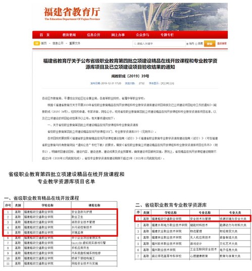 2019年12月31日,福建省教育廳公布了省級職業(yè)教育第四批立項建設(shè)精品在線開放課程和專業(yè)教學資源庫項目及已立項建設(shè)項目驗收結(jié)果,福建船政交通職業(yè)學院安全技術(shù)與管理專業(yè)群收獲優(yōu)異成績。本次安全技術(shù)與管理專業(yè)群共獲得5門省級職業(yè)精品在線開放課程立項,安全技術(shù)與管理專業(yè)獲專業(yè)教學資源庫立項。