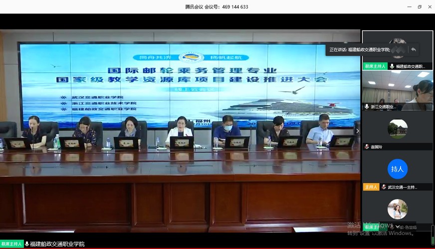 2020年7月10日,學院聯(lián)合武漢交通職業(yè)學院和浙江交通職業(yè)技術(shù)學院共同主持召開職業(yè)教育國際郵輪乘務(wù)管理專業(yè)國家級教學資源庫項目建設(shè)工作推進大會。由于新冠肺炎疫情防控常態(tài)化的需要,本次會議在騰訊會議網(wǎng)絡(luò)平臺上召開,學院陳艷紅副院長、航海技術(shù)系江明光主任協(xié)同資源庫各課程負責人共同參會。來自行業(yè)企業(yè)的專家和各參建單位代表共計一百三十多人,以個人連線的方式加入線上會議。