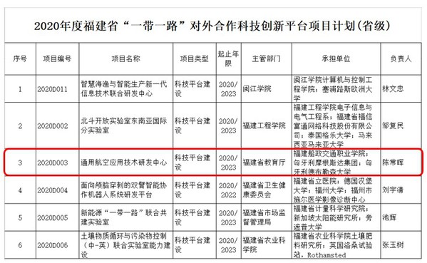 福建省科學(xué)技術(shù)廳近日發(fā)文,由福建船政交通職業(yè)學(xué)院與摩根斯達(dá)集、匈牙利德布勒森大學(xué)共同建設(shè)的“通用航空應(yīng)用技術(shù)研發(fā)中心”列入2020年度福建省“一帶一路”對外合作科技創(chuàng)新平臺項目計劃(省級)。