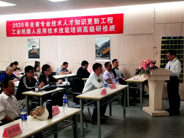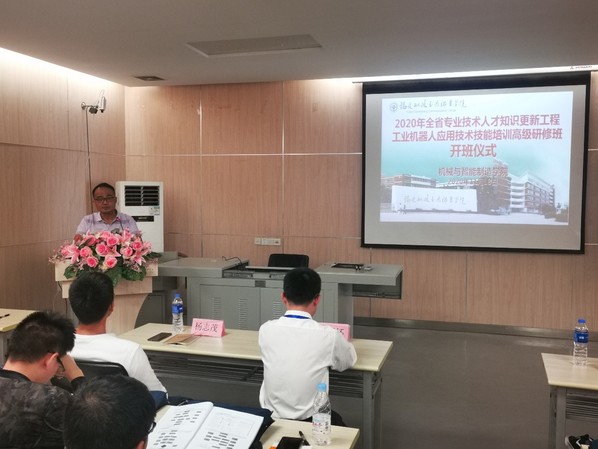 楊開懷院長(zhǎng)首先對(duì)參加開班儀式的領(lǐng)導(dǎo)和嘉賓表示歡迎,對(duì)給予此次培訓(xùn)技術(shù)支持的福建閩大科技有限公司表示感謝。接著介紹了機(jī)械與智能制造學(xué)院工業(yè)機(jī)器人專業(yè)的歷史沿革,以及工業(yè)機(jī)器人應(yīng)用技術(shù)領(lǐng)域近年來的發(fā)展前景,我院在工業(yè)機(jī)器人專業(yè)課程優(yōu)化、實(shí)驗(yàn)室建設(shè)、技能競(jìng)賽等方面取得的優(yōu)異成績(jī),并努力致力于為我省乃至全國(guó)的工業(yè)機(jī)器人行業(yè)培養(yǎng)高素質(zhì)技能人才。