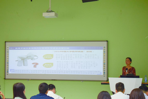 楊小霞副教授就新時代加強高校教師隊伍建設(shè)的若干思考展開講學(xué),從“深刻理解習(xí)近平總書記關(guān)于教師隊伍建設(shè)的重要論述”到“改革開放以來我國高校教師隊伍建設(shè)政策回顧”到“充分認(rèn)識加強高校教師隊伍建設(shè)的戰(zhàn)略背景”再到“進(jìn)一步明確新時代高校教師隊伍建設(shè)的突出重點”最后到“新時代高校教師隊伍建設(shè)的路徑選擇”,給老師們詳細(xì)講解了新時代加強高校教師隊伍建設(shè)應(yīng)當(dāng)如何進(jìn)行。楊小霞副教授還強調(diào):師者,要有仁愛之心,愛學(xué)生的情懷應(yīng)當(dāng)具備。