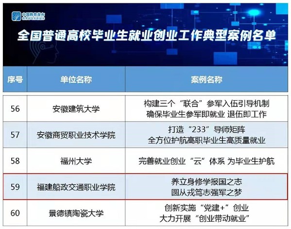 2021年11月26日,教育部發(fā)布公告,公布了100個(gè)全國(guó)普通高校畢業(yè)生就業(yè)創(chuàng)業(yè)工作典型案例,我院《養(yǎng)立身修學(xué)報(bào)國(guó)之志 圓從戎篤志強(qiáng)軍之夢(mèng)》案例成功入選,成為福建省唯一入選的高職院校。