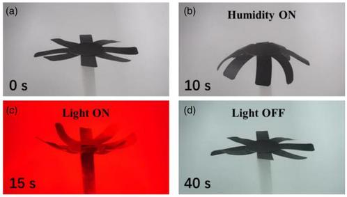 為了驗(yàn)證執(zhí)行器在實(shí)際應(yīng)用中的潛力,提出了三種基于執(zhí)行器的演示模型。第一個(gè)模型是仿生花(圖4)。通過(guò)交替加濕和近紅外光照射,可以表現(xiàn)出雙向彎曲變形,模仿自然花朵的開(kāi)合運(yùn)動(dòng)。