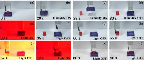 研究表明該致動(dòng)器由GO薄膜真空過(guò)濾和PET薄膜熱壓制成(圖1)。由于濕膨脹效應(yīng),GO/PET致動(dòng)器可由濕氣驅(qū)動(dòng)(圖2)。受益于光熱轉(zhuǎn)換的能力以及GO和PET之間熱膨脹系數(shù)的差異,GO/PET致動(dòng)器可以由光驅(qū)動(dòng)(圖3)。