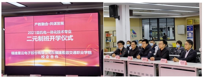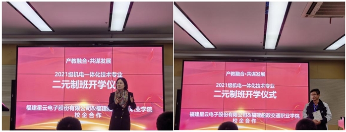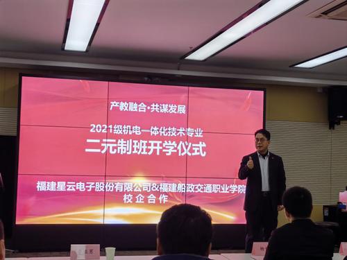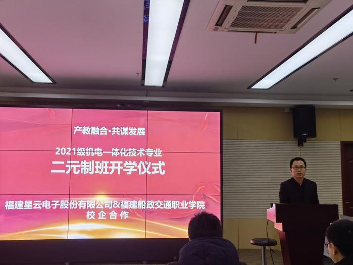2022年1月13日,福建船政交通職業(yè)學(xué)院機(jī)械與智能制造學(xué)院2021級(jí)機(jī)電一體化技術(shù)專業(yè)“二元制”班級(jí)開學(xué)儀式在福建星云電子股份有限公司隆重舉行。福建星云電子股份有限公司首席運(yùn)營(yíng)官黃榮發(fā)先生,人力資源總監(jiān)魯亞男女士,機(jī)械與智能制造學(xué)院楊開懷院長(zhǎng),王水發(fā)副院長(zhǎng)等校企工作人員以及“二元制”班級(jí)的所有同學(xué)共同出席典禮。