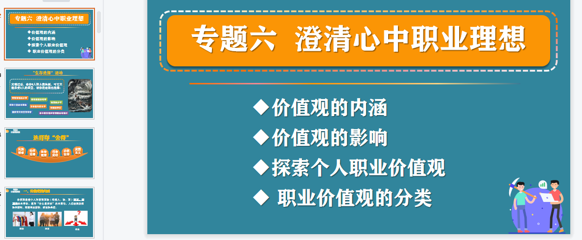 首先由黃其連老師詳細(xì)介紹《專題六 澄清心中職業(yè)理想》共2課時(shí)的整體教學(xué)設(shè)計(jì)。