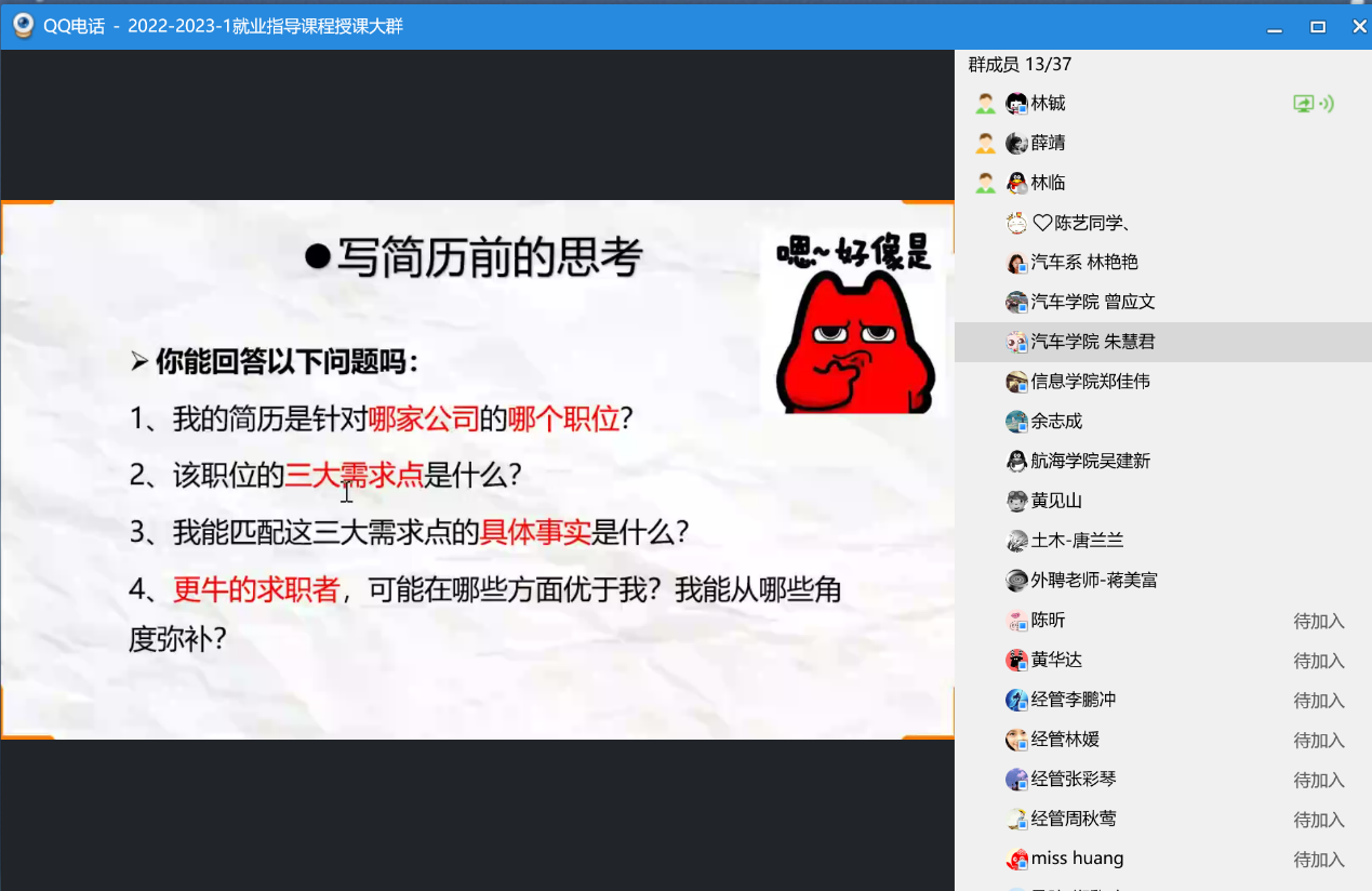 本次教研活動(dòng)圍繞《第四講 求職設(shè)計(jì)》進(jìn)行集體備課,深入探討如何通過(guò)教學(xué)引導(dǎo),幫助學(xué)生迅速掌握制作“金簡(jiǎn)歷”的技巧,提高學(xué)生簡(jiǎn)歷的“含金量”。簡(jiǎn)歷如同個(gè)人名片一樣,一份優(yōu)秀的簡(jiǎn)歷往往是取得成功的重要條件。集體備課會(huì)上,主備課教師林鋮老師從“人才畫(huà)像”“用資料分析法分析就業(yè)信息”“撰寫求職信”“寫出一份能撩到HR的簡(jiǎn)歷”四個(gè)方面, 結(jié)合自身教學(xué)經(jīng)驗(yàn)做了求職材料制作的經(jīng)驗(yàn)分享。