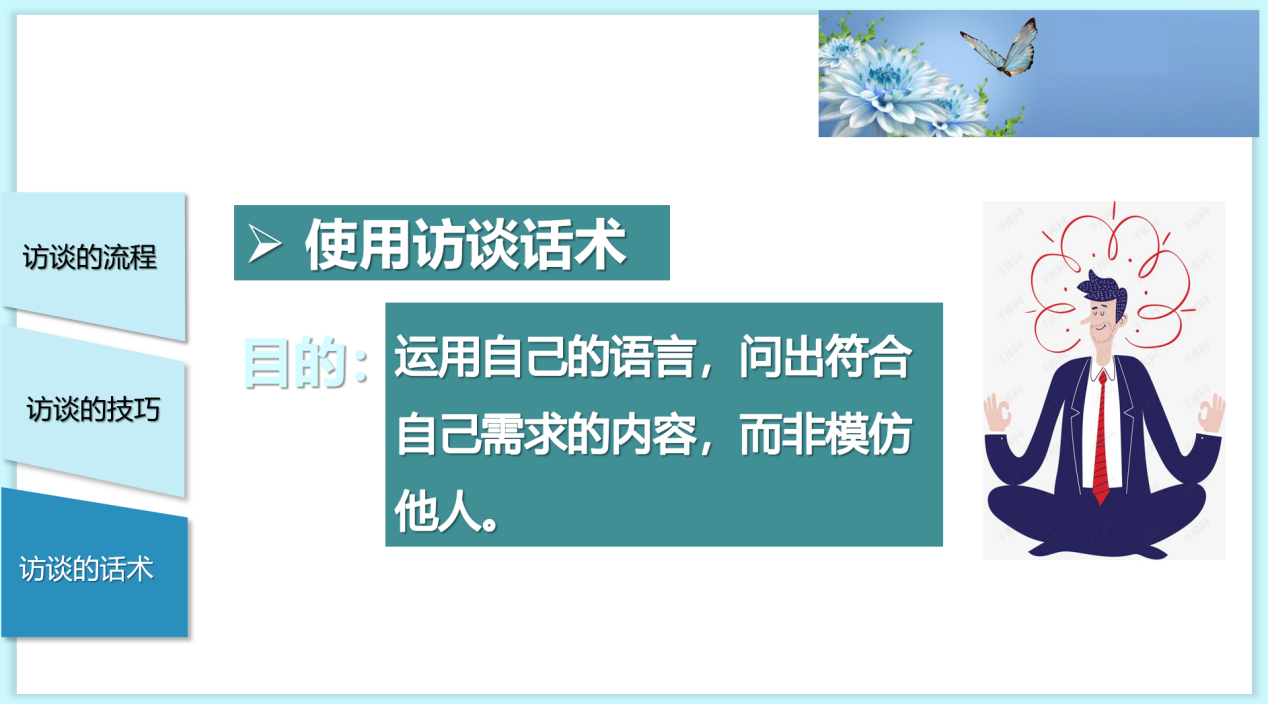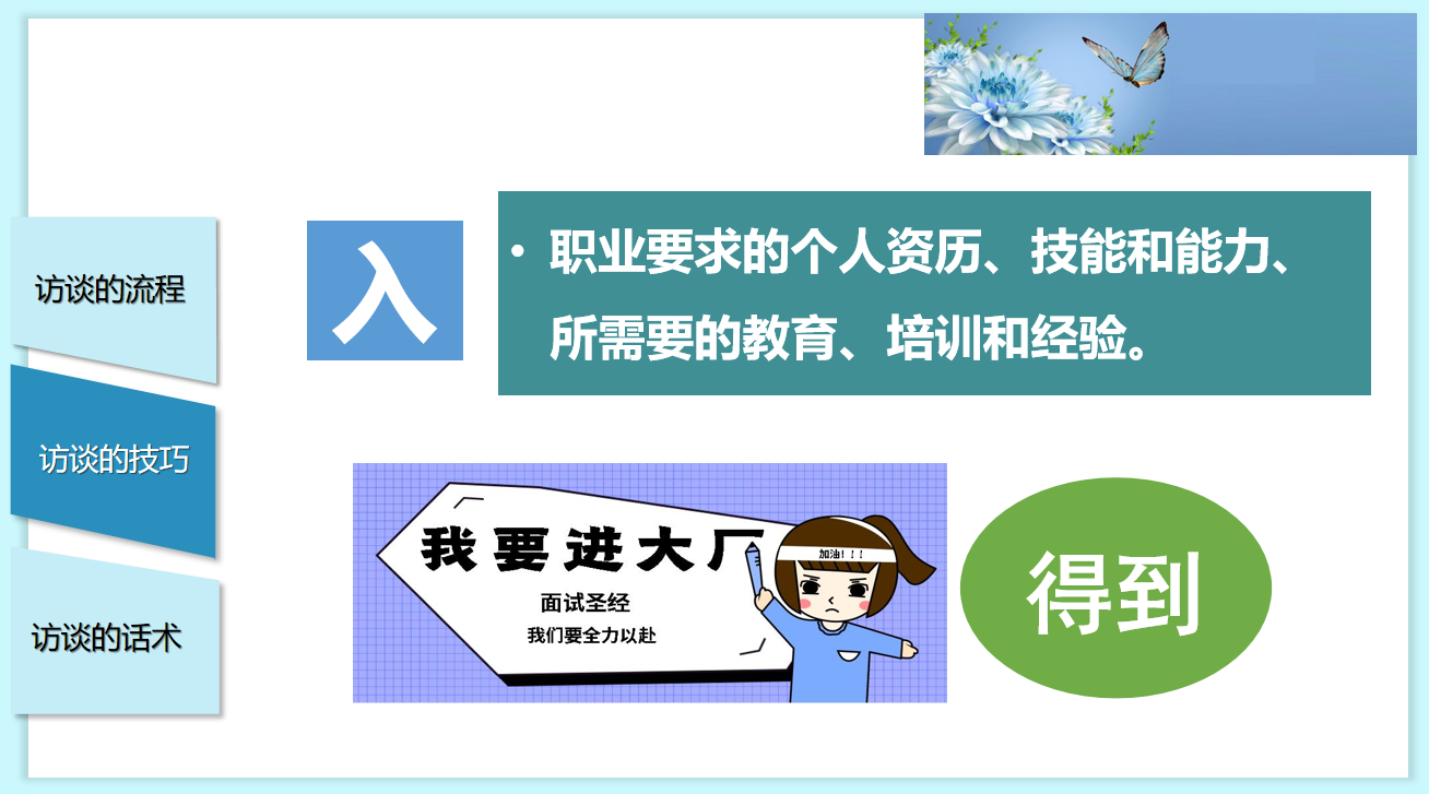 戰(zhàn)偉老師站在企業(yè)的角度,強調從“行業(yè)+組織+崗位”的角度理解職業(yè),從“入、做、得、拓”四個方面深入開展生涯人物訪談活動,同時結合實例建議了適合的教學方法和重難點的突破策略。