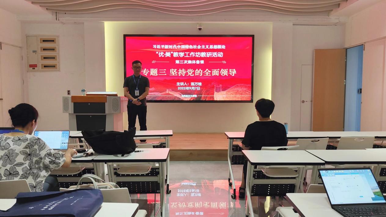 2022年9月7日,馬克思主義學(xué)院“毛澤東思想和中國特色社會主義理論體系概論”教研室全體專兼職教師在圖書館三樓研學(xué)中心開展了“優(yōu)·美”教學(xué)工作坊教研活動。本次教研的內(nèi)容是“習(xí)近平新時代中國特色社會主義思想概論”的專題三 堅持黨的全面領(lǐng)導(dǎo)。本次集體備課會由連萬桂老師主講,范碧華老師進(jìn)行示范性教學(xué)。