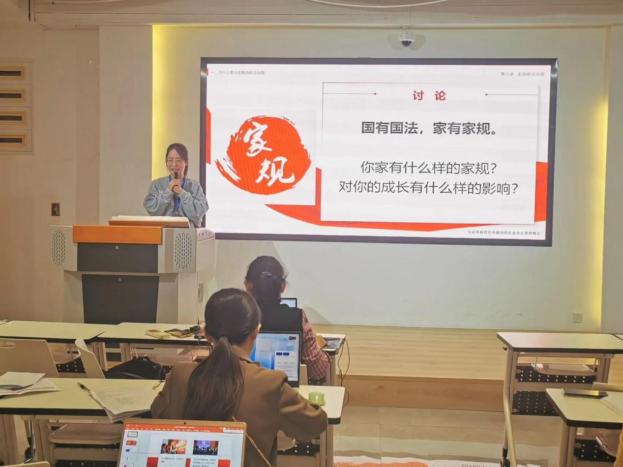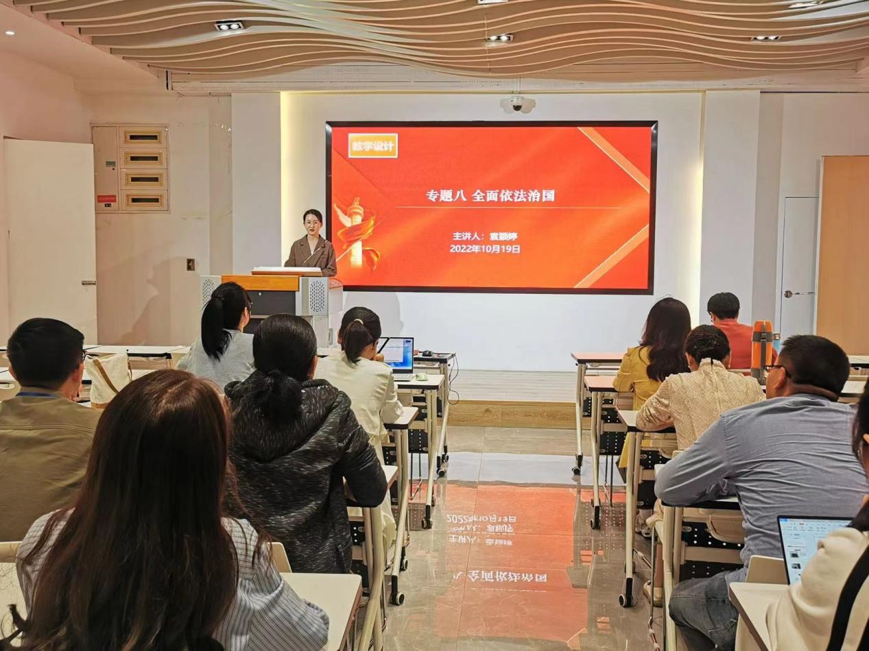 更好推動習(xí)近平新時代中國特色社會主義思想進(jìn)教材、進(jìn)課堂、進(jìn)頭腦,2022年10月19日,馬克思主義學(xué)院“優(yōu)·美”教學(xué)工作坊舉辦集體備課活動。本次活動由教研室主任洪凌艷老師主持,主講人為袁穎婷老師,片段教學(xué)老師分別為郭麗超與王輝老師。備課主題為專題八——全面依法治國。
