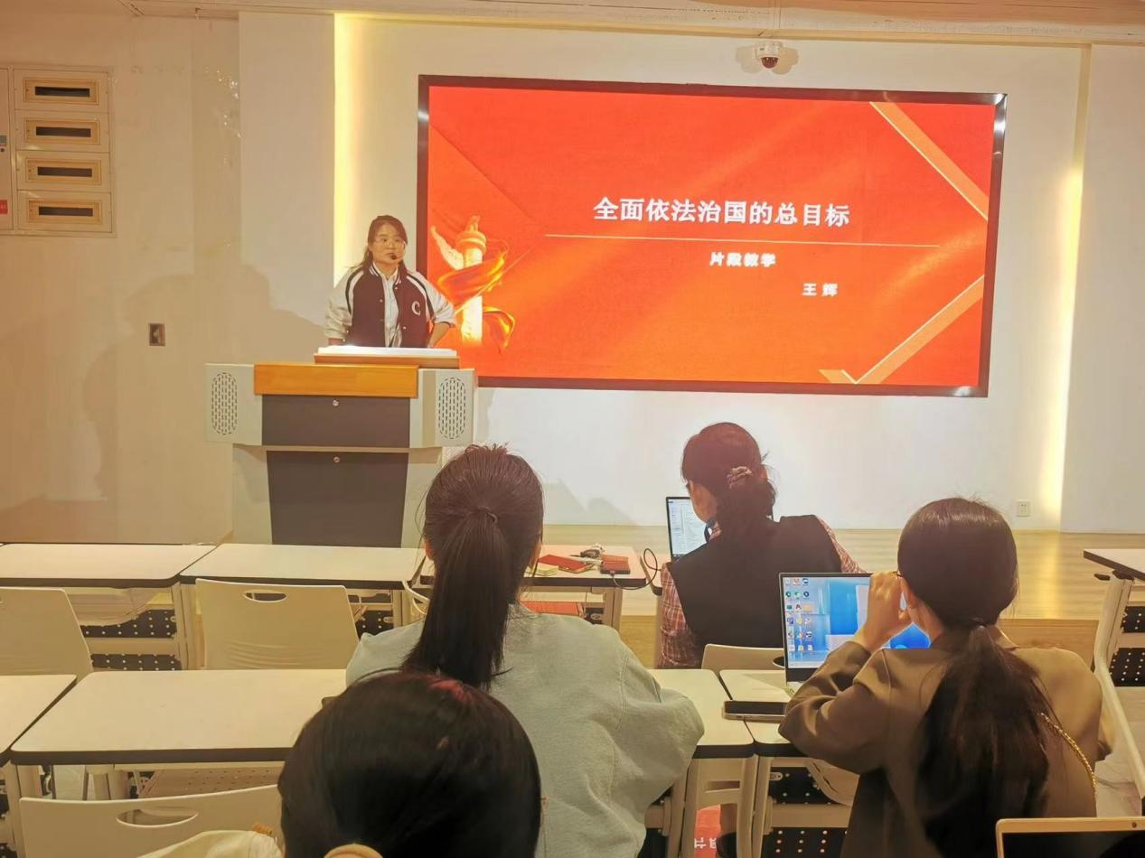 王輝老師則針對全面依法治國的總目標(biāo)進(jìn)行片段教學(xué)。結(jié)合生動案例,通過視頻導(dǎo)入等,詳細(xì)講解了全面依法治國的總目標(biāo)是建設(shè)中國特色社會主義法治體系、建設(shè)社會主義法治國家,教學(xué)過程相當(dāng)精彩。