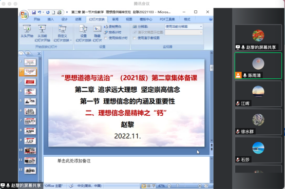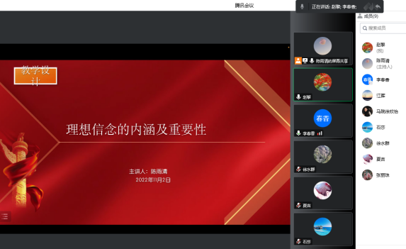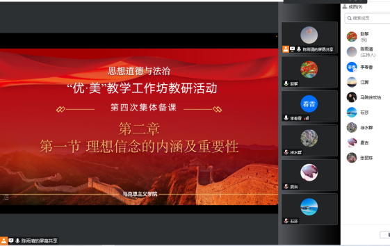 11月2日,馬克思主義學(xué)院思想道德與法治教研室開展了“優(yōu)·美”教學(xué)工作坊線上集體備課活動(dòng)。本次教研活動(dòng)圍繞《思想道德與法治》第二章《追求遠(yuǎn)大理想堅(jiān)定崇高信念》第一節(jié)《理想信念的內(nèi)涵及重要性》展開。此次教研活動(dòng)由陳雨清老師擔(dān)任主講,趙黎老師進(jìn)行無聲片段教學(xué)展示。德法教研室全體專任教師和部分校內(nèi)兼任教師老師參加了此次活動(dòng)。