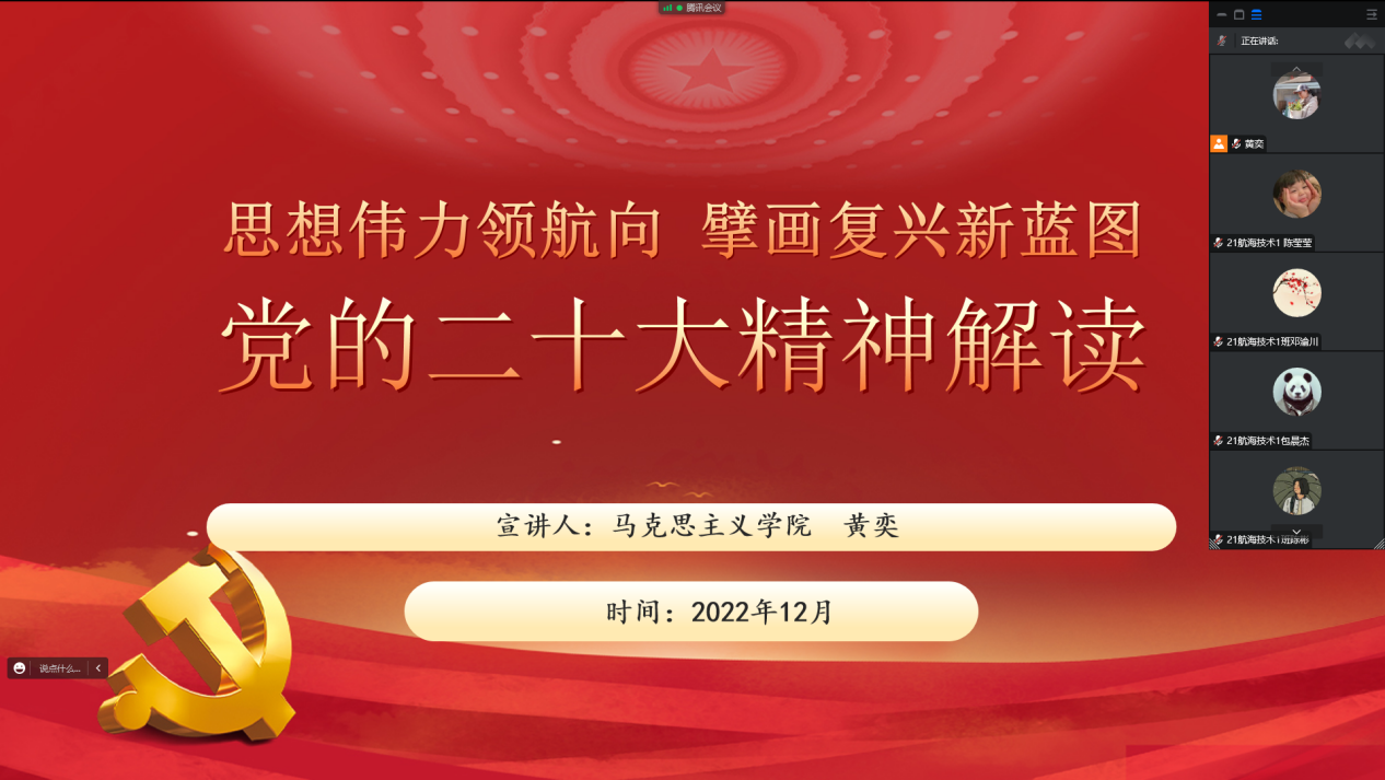 為深入學(xué)習(xí)宣傳貫徹黨的二十大精神,把學(xué)院師生的思想統(tǒng)一到黨的二十大精神上來,12月19日,應(yīng)航海學(xué)院邀請,馬克思主義學(xué)院院長黃奕教授為120名航海學(xué)院學(xué)生做了以“青春向黨不負(fù)韶華,踔厲奮發(fā)勇創(chuàng)輝煌”為主題的黨的二十大精神宣講,深入講解黨的二十大報告要點,傳遞黨的二十大精神。