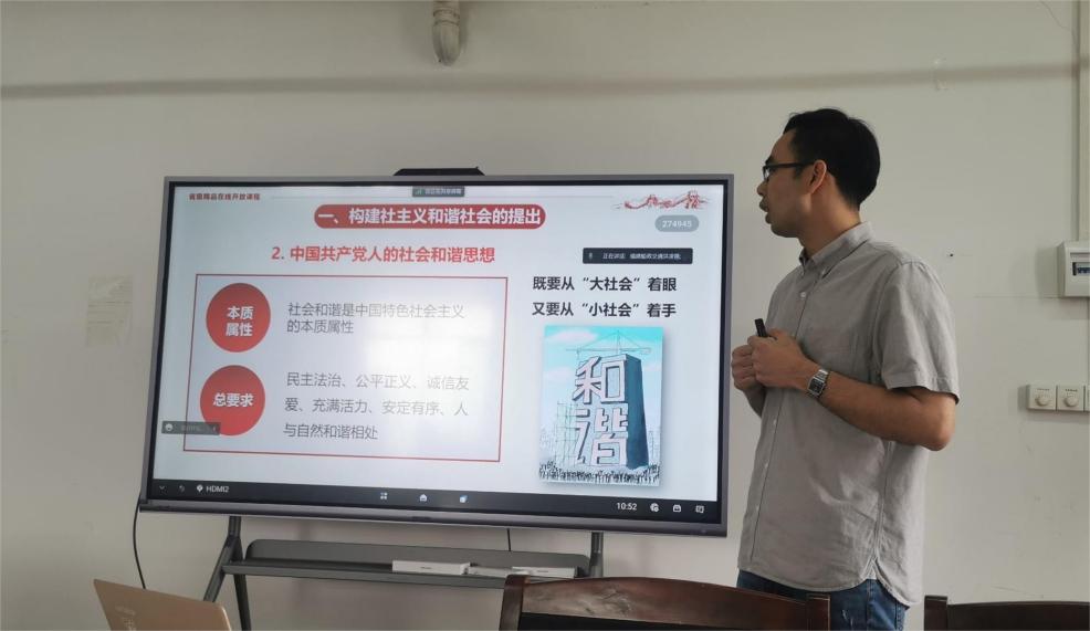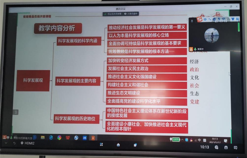 2023年5月17日,馬克思主義學(xué)院“毛澤東思想和中國特色社會主義理論體系概論”教研室全體專兼職教師在圖書館11樓1101室開展了“優(yōu)·美”教學(xué)工作坊教研活動。本次教研活動圍繞概論第八章“科學(xué)發(fā)展觀”展開教學(xué)研討活動,由黃晉京老師擔(dān)任主備課人。