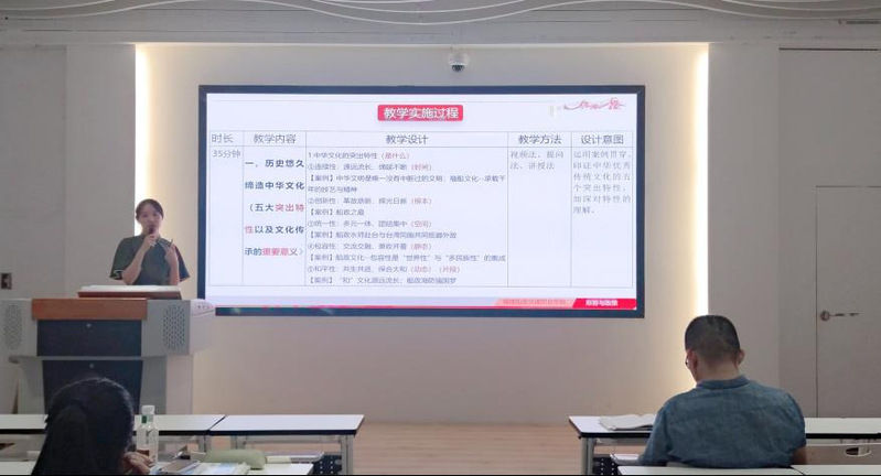 陳雨清老師就歷史悠久締造中華文化、培根鑄魂推動文化繁榮、篤定前行建設(shè)現(xiàn)代文明三個方面,深刻闡述了在新的起點上繼續(xù)推動文化繁榮、建設(shè)文化強國、建設(shè)中華民族現(xiàn)代文明的新時代文化使命。對本專題的邏輯結(jié)構(gòu)和教學(xué)設(shè)計做了詳細的分享和介紹。結(jié)合船政文化貫穿中華傳統(tǒng)文化的五個特性,引用《逃出大英博物館》、“村超”等當前社會熱點文化大事件作為教學(xué)案例,分享授課創(chuàng)意,極大的豐富了該主題的備課內(nèi)容。
