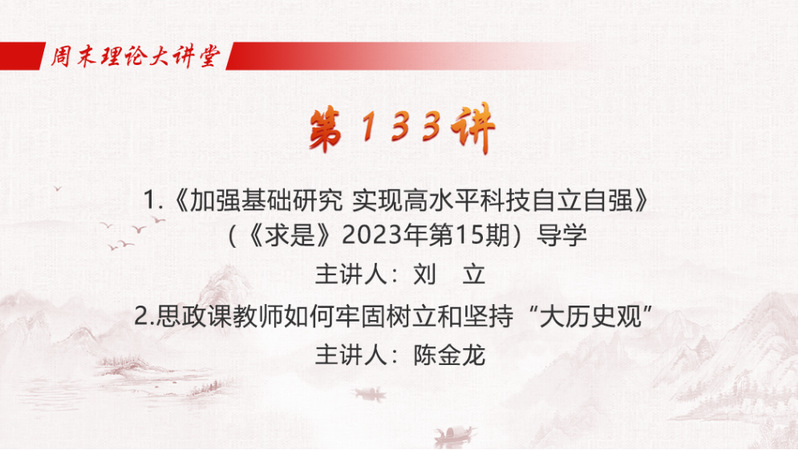 本期的“周末理論大講堂”主講內(nèi)容分別是中國(guó)科學(xué)技術(shù)大學(xué)馬克思主義學(xué)院教授劉立主講的《加強(qiáng)基礎(chǔ)研究 實(shí)現(xiàn)高水平科技自立自強(qiáng)》(《求是》2023年第15期)導(dǎo)學(xué)和華南師范大學(xué)學(xué)術(shù)委員會(huì)副主任、馬克思主義學(xué)院教授陳金龍主講的《思政課教師如何牢固樹立和堅(jiān)持“大歷史觀”》。