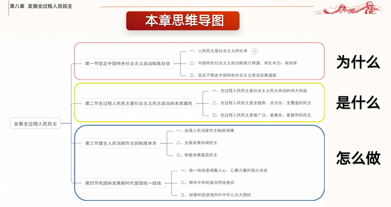 范碧華老師首先強調(diào)發(fā)展全過程人民民主是新時代我國民主政治建設(shè)的歷史性成就、標志性成果,明確本章在教材中的地位;接著通過教學(xué)思維導(dǎo)圖,明晰第八章四節(jié)內(nèi)容間的整體邏輯關(guān)系,明確教學(xué)難重點;在學(xué)情分析基礎(chǔ)上,對于本章的教學(xué)方法、案例選取給出教學(xué)建議。整個教學(xué)設(shè)計邏輯清晰、目標明確,較好地提升了教師對第八章教學(xué)內(nèi)容及邏輯的認識。