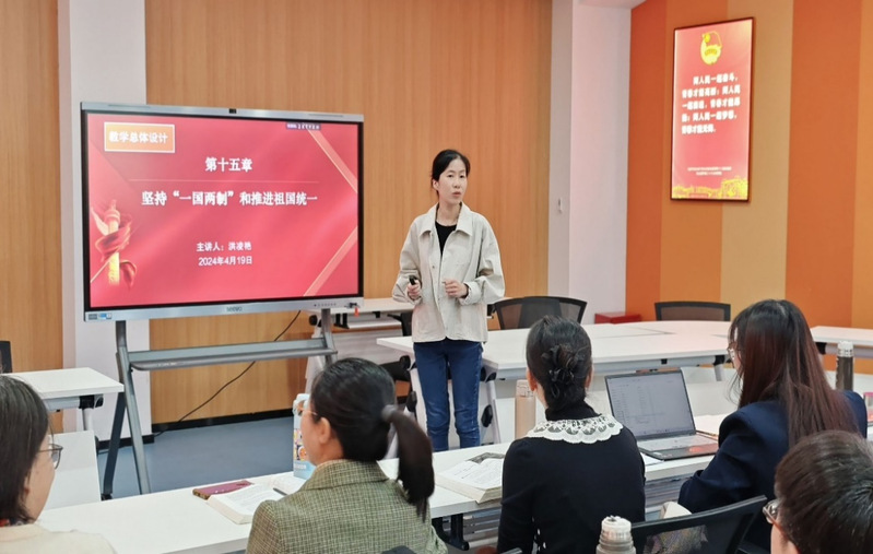 備課活動圍繞《習近平新時代中國特色社會主義思想概論》課程第十五章《堅持“一國兩制”和推進祖國統(tǒng)一》展開。洪凌艷老師擔任教學設計主講,趙黎老師與連萬桂老師分別做片段教學。