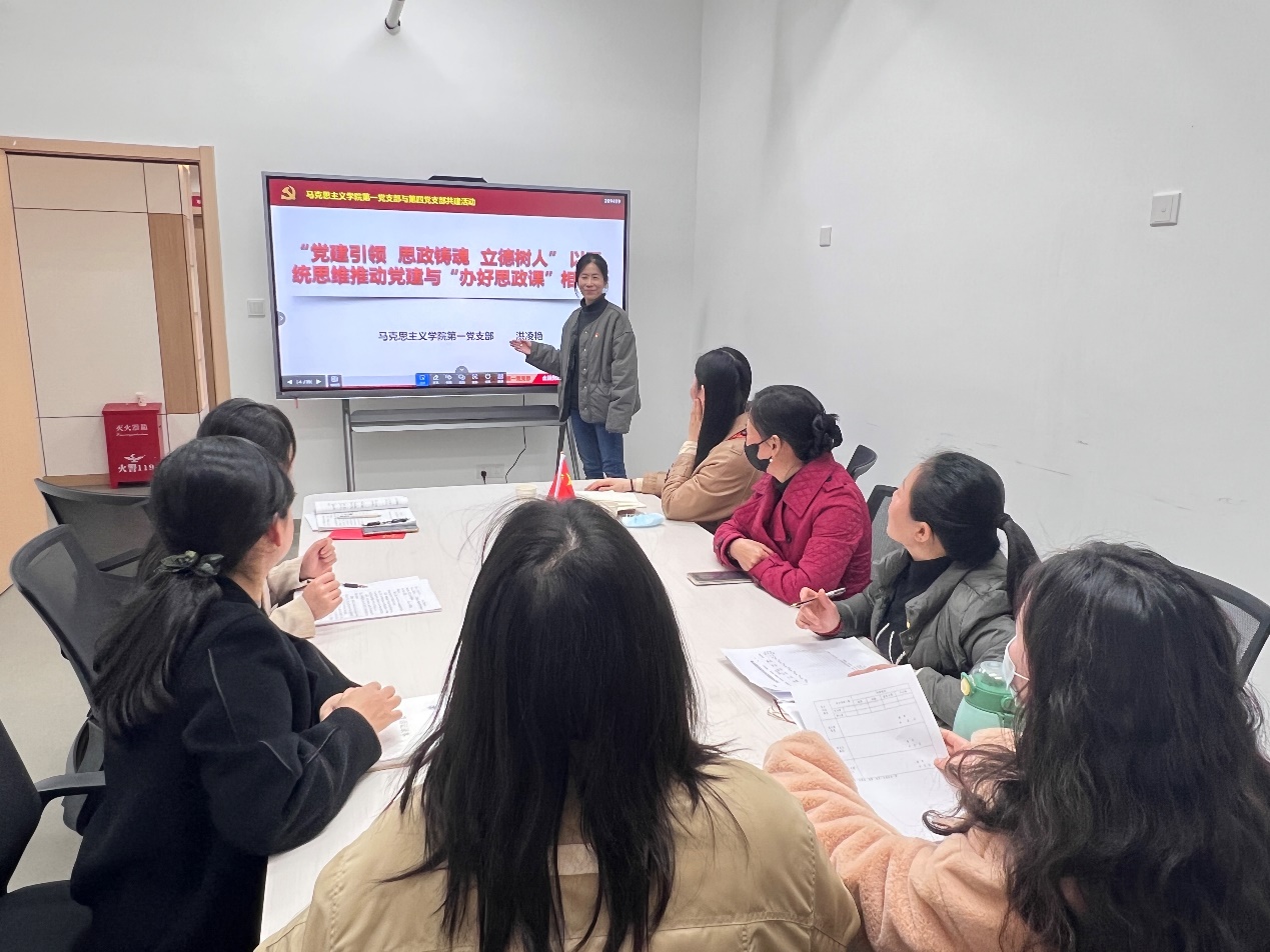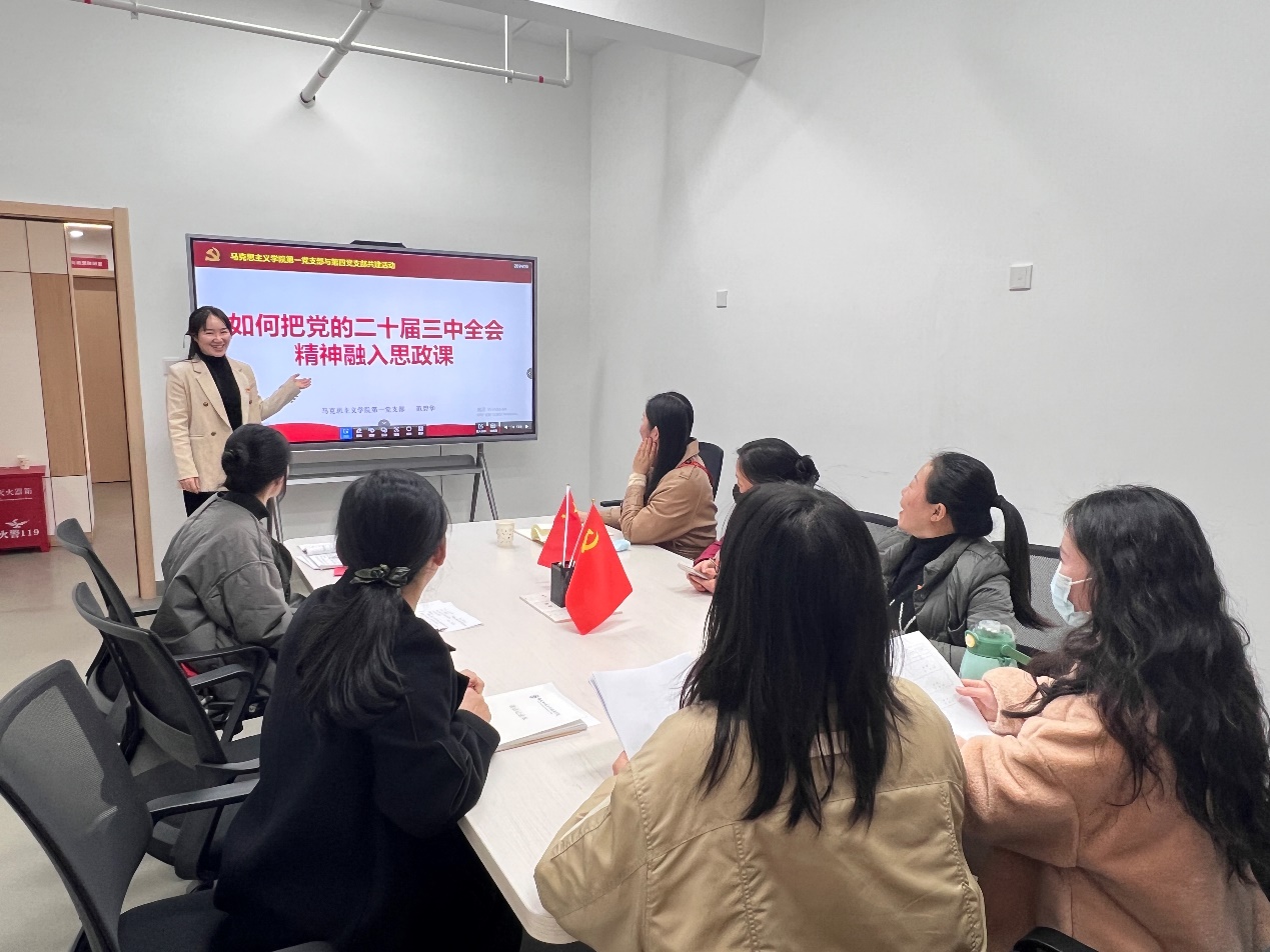 第一黨支部作為全國(guó)樣板支部,集中了《習(xí)近平新時(shí)代中國(guó)特色社會(huì)主義思想概論》課程和《毛澤東思想和中國(guó)特色社會(huì)主義理論體系概論》課程的幾位教學(xué)骨干,在發(fā)揮黨員先鋒模范作用、創(chuàng)新?tīng)?zhēng)優(yōu)方面可圈可點(diǎn)。在共建活動(dòng)中,第一黨支部書(shū)記洪凌艷以《“黨建引領(lǐng),思政鑄魂,立德樹(shù)人”——以系統(tǒng)思維推動(dòng)黨建與“辦好思政課”》為題做了創(chuàng)建全國(guó)樣板支部的經(jīng)驗(yàn)分享;第一黨支部副書(shū)記范碧華就如何把黨的二十屆三中全會(huì)的精神融入思政課交流了自己的看法。