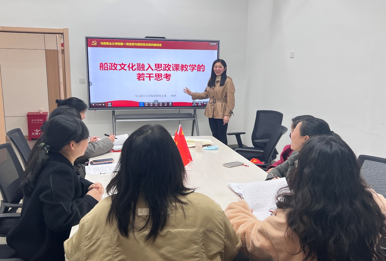 第四黨支部建在船政文化教研室上,支部成員中有兩位是正高級(jí)職稱(chēng),師資基礎(chǔ)雄厚。共建活動(dòng)中,第四黨支部書(shū)記欒靜分享了將船政文化有機(jī)融入思政課的一些認(rèn)識(shí);科研能力較強(qiáng)的江冰教授分享了她在課題申報(bào)、結(jié)項(xiàng)方面的經(jīng)驗(yàn)。