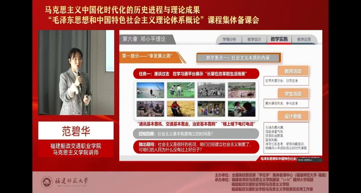 本次集備會由全國高校思政課“手拉手”集體備課中心(福建師范大學(xué)—福建?。┲鬓k,福建省高校馬克思主義學(xué)院建設(shè)“1+N”福州大學(xué)組團(tuán)、福建船政交通職業(yè)學(xué)院馬克思主義學(xué)院、福建船政交通職業(yè)學(xué)院馬克思主義學(xué)院黃奕名師工作室承辦。概論教研室教師范碧華在本次集體備課會中進(jìn)行說課展示,其他教師在線下共同觀摩學(xué)習(xí)。