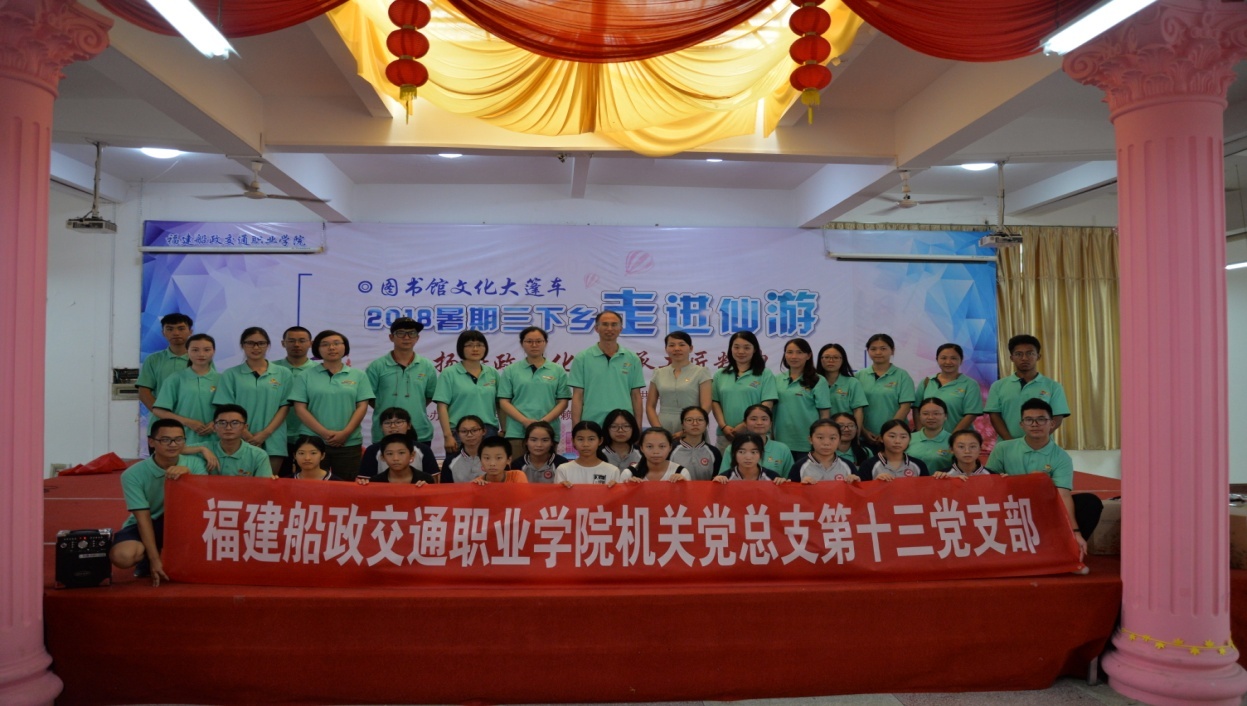 為深入學(xué)習(xí)宣傳貫徹習(xí)近平新時(shí)代中國特色社會(huì)主義思想和黨的十九大精神,圍繞助力鄉(xiāng)村振興戰(zhàn)略和精準(zhǔn)脫貧,引導(dǎo)我院青年學(xué)生貢獻(xiàn)青春智慧和力量,積極投身社會(huì)實(shí)踐。2018年暑期,機(jī)關(guān)黨總支第十三黨支部帶領(lǐng)圖書館思源志愿服務(wù)隊(duì)共計(jì)25名師生依托 “文化大篷車”項(xiàng)目,組成了圖書館暑期三下鄉(xiāng)“教育關(guān)愛服務(wù)隊(duì)”,帶著我院師生的愛心,通過以“弘揚(yáng)船政文化 傳承工匠精神”為主旨的一系列服務(wù)活動(dòng),在仙游開展了為期一周的暑期社會(huì)實(shí)踐活動(dòng),將滿滿的愛意傳遞到仙游縣市民的心中。