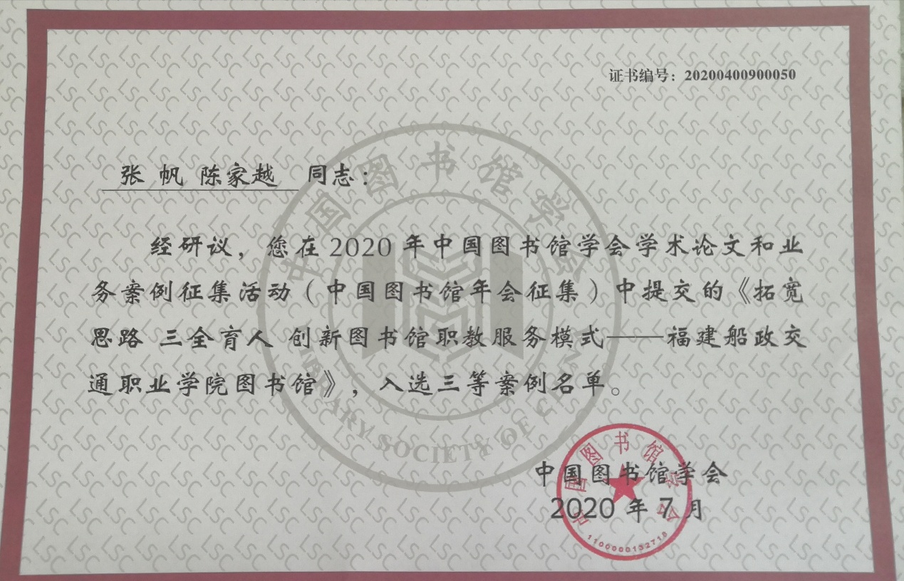 2020年,中國圖書館學(xué)會(huì)主辦了以“滋養(yǎng)民族心靈 培育文化自信”為主題的中國圖書館學(xué)會(huì)學(xué)術(shù)論文和業(yè)務(wù)案例征集活動(dòng),共設(shè)38個(gè)分主題,分為“中國圖書館年會(huì)征集”和“專題交流活動(dòng)征集”兩個(gè)大類組織實(shí)施。本次征集活動(dòng)共計(jì)征集稿件1200余篇,經(jīng)各專家組和研議會(huì)綜合評(píng)定,我館選送的業(yè)務(wù)案例《拓寬思路 三全育人創(chuàng)新圖書館職教服務(wù)模式》入選三等案例。