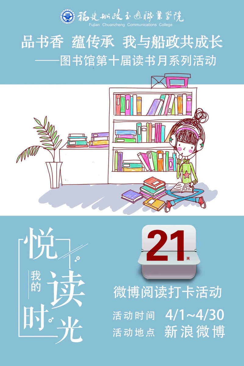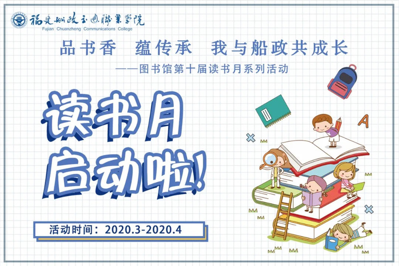 為了引導(dǎo)廣大師生養(yǎng)成多讀書、讀好書、好讀書的習(xí)慣,在第25個“世界讀書日”來臨之際,我院圖書館于2020年3月—4月開展“品書香,蘊船政,我與船政共成長”圖書館第十屆讀書月系列活動,活動包含豐富多彩、形式多樣的線上閱讀活動,同時我們也為大家準(zhǔn)備了各種精美的禮品。希望廣大師生及時關(guān)注我館的微博、微信公眾號,歡迎大家的參與!