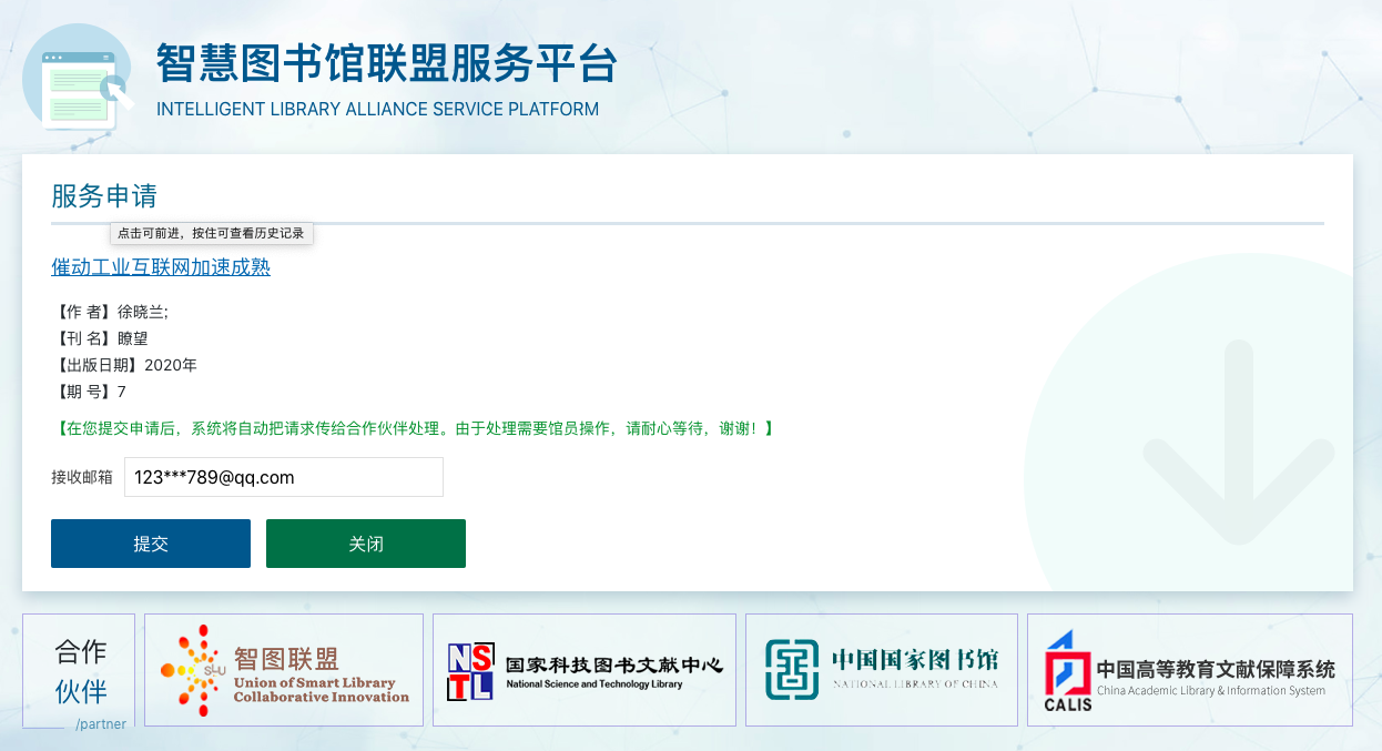 全文獲?。?/strong>圖書館館藏文獻直接定位到來源數(shù)據(jù)庫,讀者可直接下載。其他資源通過全國智慧圖書館聯(lián)盟服務(wù)平臺提供文獻保障服務(wù),24小時內(nèi)響應(yīng)申請。