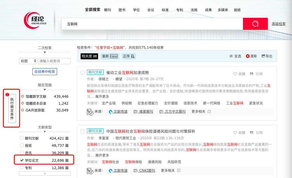 在經(jīng)綸的首頁可快速搜素10億級文獻數(shù)據(jù)的資源檢索,搜索關(guān)鍵詞“互聯(lián)網(wǎng)”,有57萬余篇文獻,在左側(cè)可進行二次篩選:舉例:選擇“學(xué)位論文”--點擊“執(zhí)行限定條件”,排序上可以選擇“相關(guān)度、最新、正序”