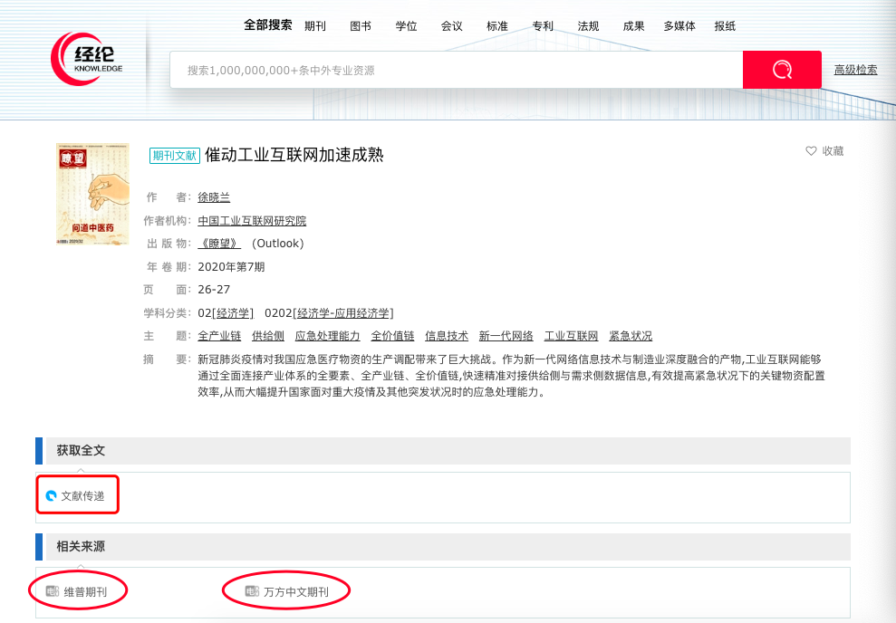 讀者選擇一篇文獻后,可以在文獻下的相關(guān)來源來查看全文,如下圖:可以點擊維普期刊或萬方中文期刊查看。也可以點擊右側(cè)的“收藏”按鈕,把此文獻收藏在個人收藏中心。