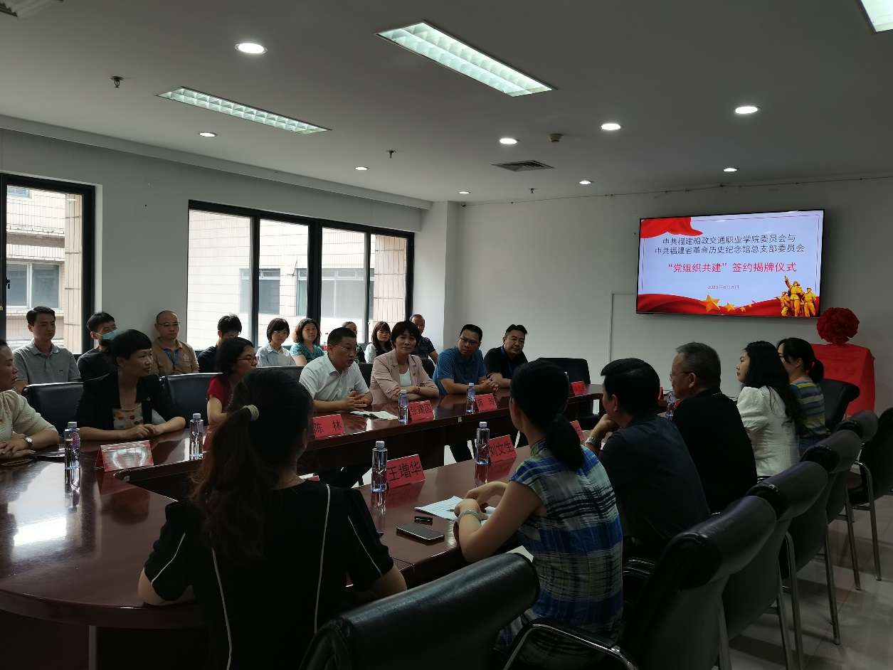 當(dāng)天,圖書館黨支部黨員代表參與中共福建船政交通職業(yè)學(xué)院委員會與中共福建省革命歷史紀(jì)念館總支部委員會黨組織共建的揭牌儀式。福建省革命歷史紀(jì)念館館長楊衛(wèi)東及相關(guān)部門領(lǐng)導(dǎo)和我校組織部部長張建國、機(jī)關(guān)黨總支書記蔣玲、圖書館館長陳林以及機(jī)關(guān)黨總支部分黨員同志等近30人參加了簽約儀式。