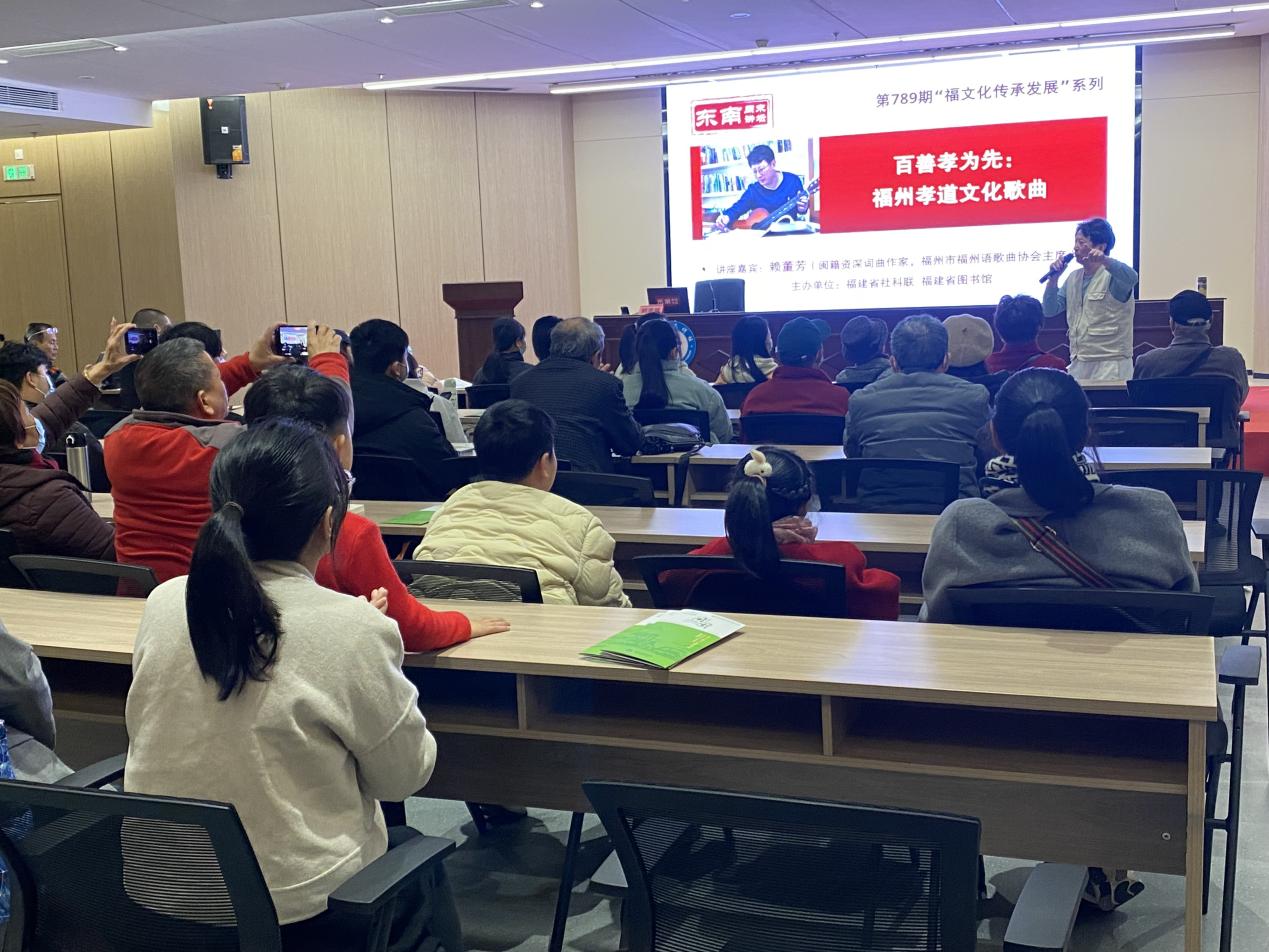 3月9日上午,為豐富校園文化生活,堅(jiān)持立德樹(shù)人的根本任務(wù),加強(qiáng)館讀溝通的橋梁建設(shè),充分發(fā)揮圖學(xué)聯(lián)團(tuán)隊(duì)的作用,圖書(shū)館“文化大篷車(chē)”攜手福建省圖書(shū)館開(kāi)展實(shí)踐服務(wù)活動(dòng)。圖學(xué)聯(lián)志愿者們走進(jìn)福建省圖書(shū)館,為“東南周末講壇”活動(dòng)提供志愿服務(wù),并觀摩閩籍資深詞曲作家、福州市福州語(yǔ)歌曲協(xié)會(huì)主席賴董芳老師《百善孝為先:福州孝道文化歌曲》的講座,享受了一場(chǎng)別開(kāi)生面的文化盛宴。