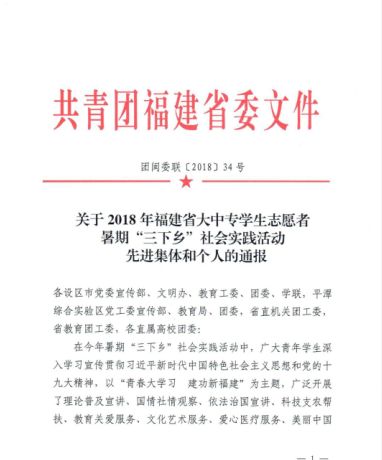 祝賀我館思源志愿隊(duì)在2018暑期三下鄉(xiāng)活動(dòng)中獲得共青團(tuán)福建省委授予的省級(jí)優(yōu)秀團(tuán)隊(duì)榮譽(yù)稱號(hào)