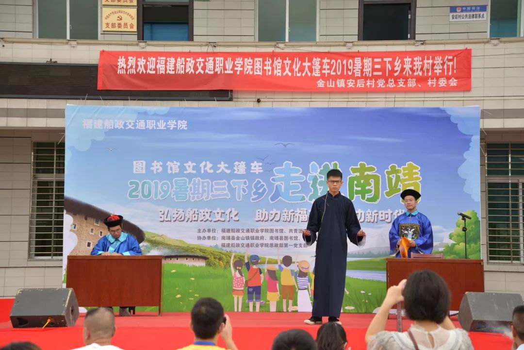 本次暑期三下鄉(xiāng)活動依托福建船政交通職業(yè)學院圖書館文化大篷車項目,結合學院特色和實際,充分發(fā)揮圖書館資源優(yōu)勢,以傳承船政文化為己任,弘揚船政學堂的職業(yè)教育理念,精益求精,密益求密,積極開展職業(yè)教育志愿服務活動,打造有船政文化特色的校園文化品牌,為廣大市民服務,讓廣大市民知道船政、了解船政、走進船政。場外活動除了啟動儀式的精彩表演外我們還將船政文化帶到現(xiàn)場以小型校史館的形式進行展覽在校史講解員的介紹下南靖父老鄉(xiāng)親對我們船政文化也非常感興趣