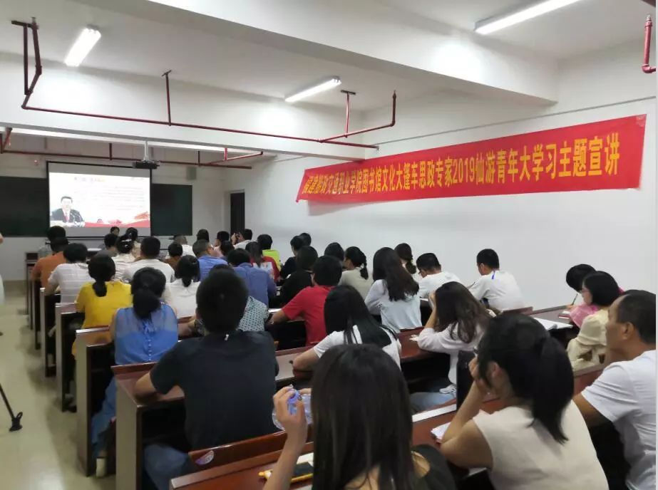 為進(jìn)一步引導(dǎo)廣大青年深入學(xué)習(xí)、宣傳、貫徹習(xí)近平新時(shí)代中國(guó)特色社會(huì)主義思想和黨的十九大精神,不忘初心、牢記使命,切實(shí)增強(qiáng)“四個(gè)意識(shí)”,堅(jiān)定“四個(gè)自信”,9月17日,仙游團(tuán)縣委在縣委黨校組織開展2019年仙游縣“青年大學(xué)習(xí)”主題宣講活動(dòng),我館文化大篷車特邀思政專家走進(jìn)此宣講活動(dòng),洪凌艷老師現(xiàn)場(chǎng)授課《平語(yǔ)近人》——習(xí)近平總書記用典,仙游團(tuán)縣委黨支部全體黨員領(lǐng)導(dǎo)干部及50余名鄉(xiāng)鎮(zhèn)(街道)、學(xué)校團(tuán)干部參加學(xué)習(xí)。
