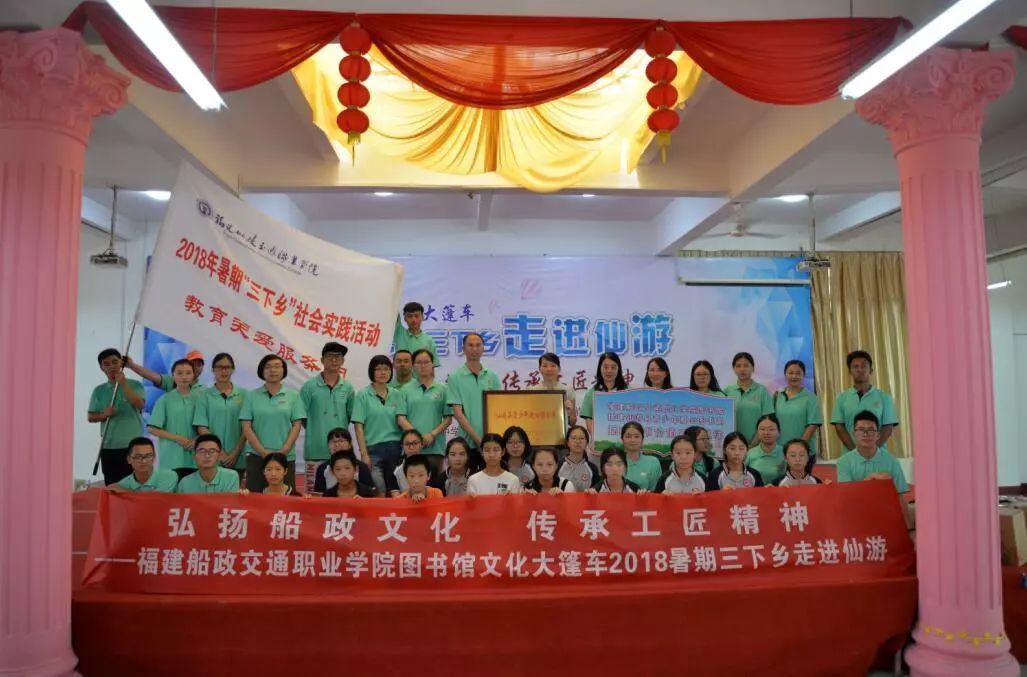 2018年我館依托圖書館“文化大篷車”項目,組成教育關(guān)愛服務(wù)團(tuán)“三下鄉(xiāng)”服務(wù)隊,開展“弘揚(yáng)船政文化,傳承工匠精神”----圖書館文化大篷車2018暑期三下鄉(xiāng)走進(jìn)仙游活動中開展豐富多彩的活動,取得喜人的成績,獲得了共青團(tuán)福建省委授予的福建省大中專學(xué)生暑期“三下鄉(xiāng)”社會實踐活動“先進(jìn)集體”的榮譽(yù)稱號.